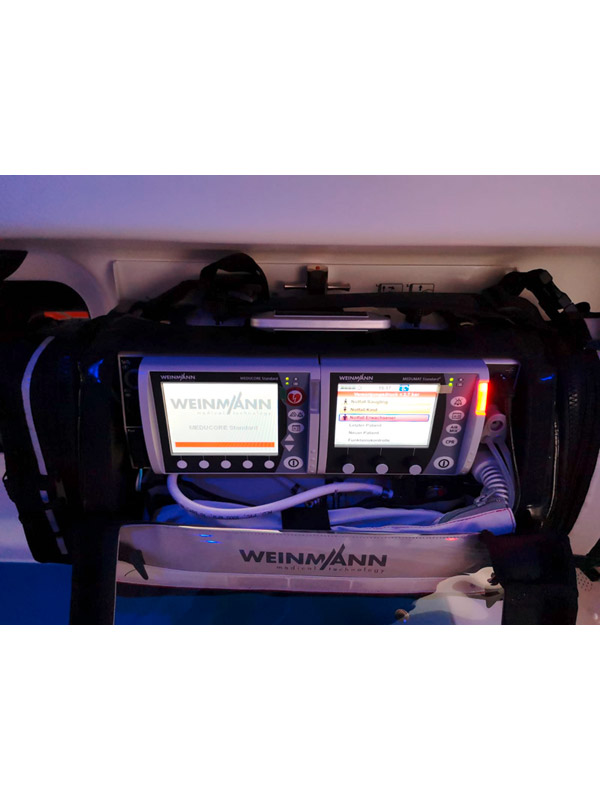 Zusätzlich halte ich noch eine Medikamentenauswahl bereit, die mir bei Bedarf „zugesteckt“ wird, ein Beatmungsgerät und ein 6-Kanal EKG-Gerät unterstützen meine Helfer ebenfalls bei Ihrer ehrenamtlichen Arbeit.
