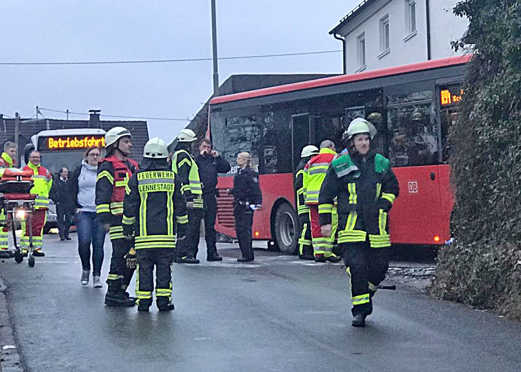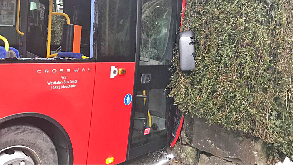 Ein Schulbus war die Lehmbergstraße in Grevenbrück bergab gefahren. Aufgrund von „Blitzeis“ habe der Busfahrer nicht mehr bremsen können. Daraufhin kam der Bus nach links von der Straße ab und prallte gegen eine Mauer.