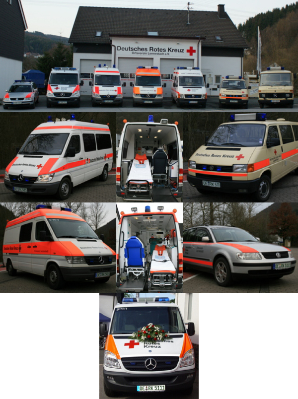 Um seine Aufgaben erfüllen zu können, hält der DRK Ortsverein Lennestadt eine Reihe von Fahrzeugen für verschiedene Einsatzzwecke vor. Die Palette reicht hier vom einfachen Krankenwagen, wie Sie ihn kennen, bis zum Einsatzleitwagen mit reichhaltiger Ausstattung.